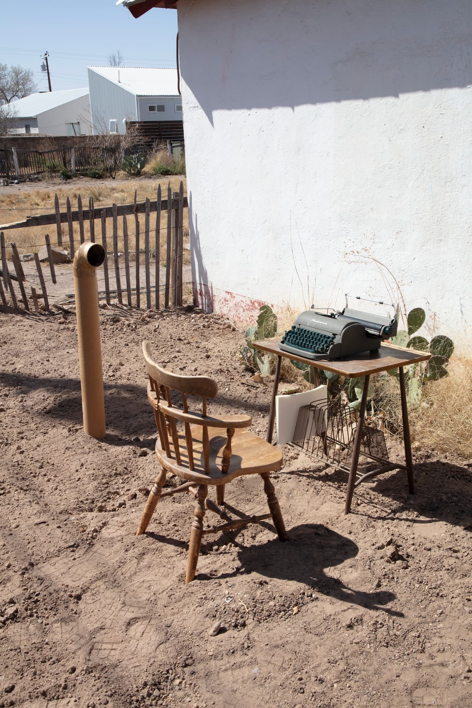 Eventually, the voice stopped, and Agredano then guided the audience on a walk to the Blackwell School National Historic Site about five minutes away, as esparza had instructed everyone back at Marfa Book Co. In front of this old schoolhouse, originally built with adobe, a metal plaque standing above gravel explains its history: named after longtime principal Jesse Blackwell, the school served as a segregated institution for children of Mexican descent from 1909 to 1965, where the curriculum enforced assimilation into Anglo-American culture.8The full text of the plaque reads: “Blackwell School: Education for local children of Mexican descent dates from 1889, when the former Methodist church became a schoolhouse. The school, named for longtime principal Jesse Blackwell, served hundreds of Hispanic children up to ninth grade. Students were told to speak only English on campus; Spanish words written on slips of paper were buried on the grounds in a mock funeral ceremony. The school closed in 1965 with integration of Marfa schools. The building sat vacant until preservation efforts by the Blackwell School Alliance, formed in 2006. The one-story schoolhouse has a modified hip roof, front-gabled entry, and plastered 24-inch thick adobe walls on a stone foundation.” At first, the crowd stood in silence, waiting for esparza to appear or speak again. But as chatter grew from the silence, someone recalled a grandparent’s childhood stories of students walking home from school, crossing train tracks in groups, afraid of having thrown rocks at them—which, according to them, happened often. Soon after, the crowd dispersed. Back at Marfa Book Co., the cardboard tube still stood upright with the typewriter beside and desert ants still crawling. The rupture into our world that esparza had opened with his voice had begun to close. Only an inked page remained as material evidence of what had transpired, pointing out the importance of recording the voices of those who still remember.